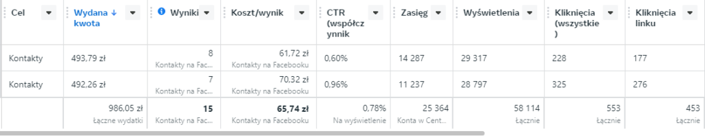 Po 26 dniach zdobyliśmy 15 kontaktów do potencjalnych klientów za sumę 985 zł, co daje 65,74 zł za kontakt.