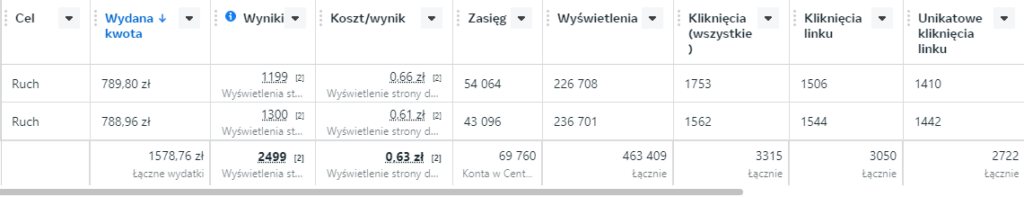 Po 30 dniach zdobyliśmy 2499 wyświetleń strony docelowej za sumę 1578 zł, co daje 0,63 zł za wyświetlenie strony.